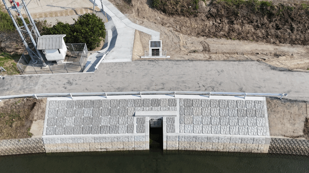 - 樋門本体は内空1200mm×1200mmで、全長11.50m。川表に吐口工。川裏に接続桝への取付工。